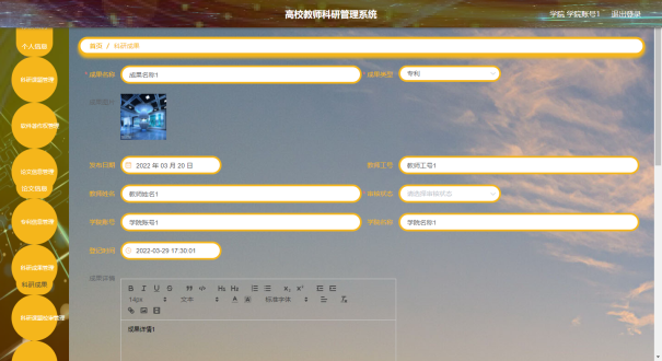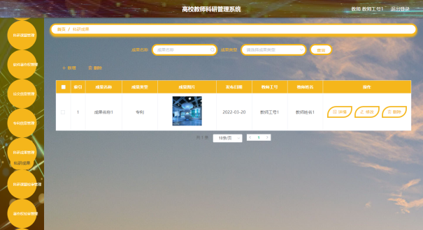 教师可以对科研成果信息进行添加,修改,删除,查询操作。