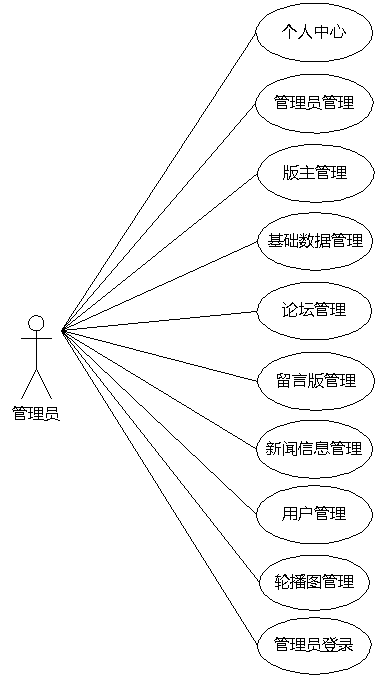 管理员管理论坛,主要是对论坛帖子增删改查以及对论坛帖子回复进行查看,对版主和用户进行管理,管理新闻等。对管理员的功能进行分析之后,将使用图3.4的管理员用例图来描述管理员的功能。