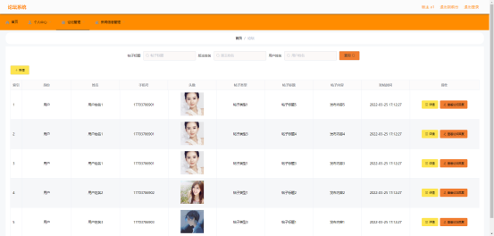 版主点击导航栏的论坛管理链接就进入论坛管理界面。论坛管理界面如图5.4所示。版主新增论坛帖子,论坛帖子有发帖时间,帖子标题,身份,姓名,手机号,帖子类型等信息,发布帖子之后,版主可以对论坛帖子的回复随时进行查看。
