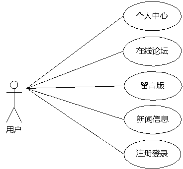 用户在前台查看新闻,在留言版对发布的留言和管理员的回复进行查看,在论坛模块发帖,评论帖子,查看帖子。对用户的功能进行分析之后,将使用图3.6的用户用例图来描述用户的功能。