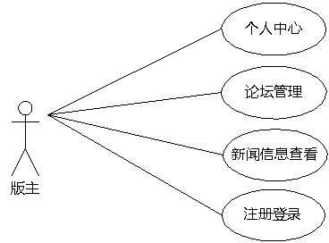 版主可以发布帖子,可以查询论坛帖子,可以对论坛帖子回复进行查看,可以回复帖子,可以删除帖子,可以查看新闻,更改个人信息等。对版主的功能进行分析之后,将使用图3.5的版主用例图来描述版主的功能。