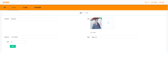 版主点击导航栏的个人信息链接就进入个人信息界面。个人信息界面如图5.6所示。本功能允许版主对个人信息,主要是联系方式,头像等进行更改。