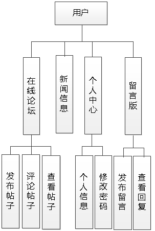 本小节运用功能结构图来描述用户具备的详细的功能,对用户的功能结构图绘制结果如图4.3所示。用户在前台查看新闻,在留言版对发布的留言和管理员的回复进行查看,在论坛模块发帖,评论帖子,查看帖子。