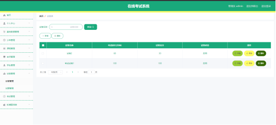 项目管理页面提供的功能操作有:查看试卷,删除试卷操作,新增试卷操作,修改试卷操作。下图就是试卷管理页面。
