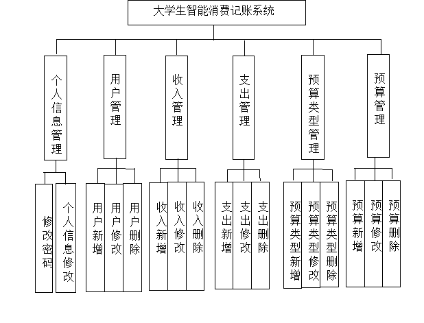 大学生智能消费记账系统系统在进行系统中功能模块的划分时,采用层次图来进行表示。层次图具有树形结构,它能使用矩形框来描绘数据信息。顶层代表的数据结构很完整,顶层下面的矩形框表示的数据就是子集数据,当然处于最下面的矩形框就是不能再进行细分的数据元素了,使用层次方框图描述系统功能能让用户一目了然,能够明白系统的功能,以及对应功能板块下面的子功能都可以清楚领会。大学生智能消费记账系统分为管理员和用户两部分操作角色,下面将对他们的功能进行阐述。