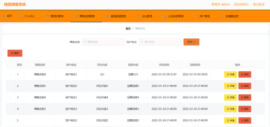 通过设计的博客评论信息管理功能模块,管理用户可以对相关的博客评论信息进行管理,比如管理用户可以查看博客评论内容信息,删除已经失效的博客评论信息记录等操作,博客评论管理界面设计如图5-9所示。