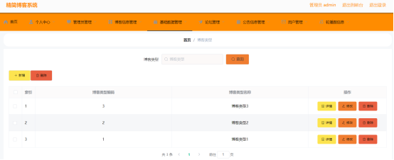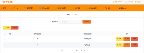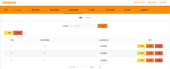 通过设计的基础数据管理功能模块,管理用户可以对相关的博客类型、帖子类型、公告类型信息进行管理,比如管理用户可以查看博客类型、帖子类型、公告类型的详情信息,删除失效的博客类型、帖子类型、公告类型信息记录等,博客类型管理界面设计如图5-5所示,帖子类型管理界面设计如图5-6所示,公告类型管理界面设计如图5-7所示。