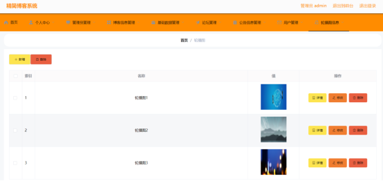 通过设计的轮播图管理功能模块,管理用户可以对相关的轮播图信息进行管理,比如管理用户可以查看轮播图名称信息,删除已经失效的轮播图信息记录等操作,轮播图管理界面设计如图5-13所示。