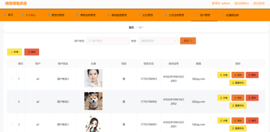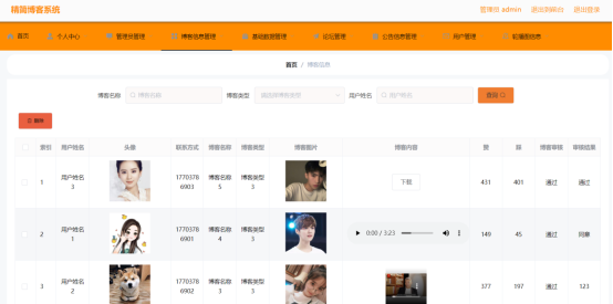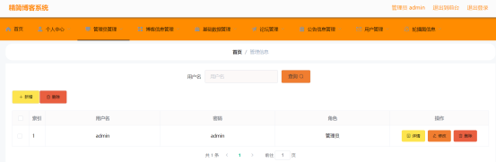 通过设计的博客信息管理功能模块,管理用户可以对相关的博客信息进行管理,比如管理用户可以查看博客内容信息,删除已经失效的博客信息记录等操作,博客信息管理界面设计如图5-8所示。