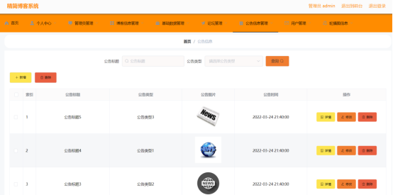 通过设计的公告信息管理功能模块,管理用户可以对相关的公告信息进行管理,比如管理用户可以查看公告时间信息,删除已经失效的公告信息记录等操作,公告信息管理界面设计如图5-12所示。