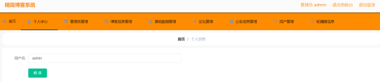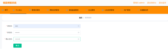 通过设计的个人中心管理功能模块,管理用户可以对相关的个人信息进行管理,比如管理用户可以更新个人账号的密码信息,修改个人账号的用户名信息等,修改密码界面设计如图5-1所示,个人信息界面设计如图5-2所示。