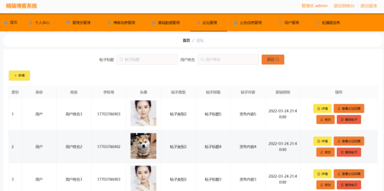 通过设计的论坛管理功能模块,管理用户可以对相关的论坛信息进行管理,比如管理用户可以查看论坛的帖子内容信息,删除已经失效的论坛信息记录等操作,论坛管理界面设计如图5-11所示。