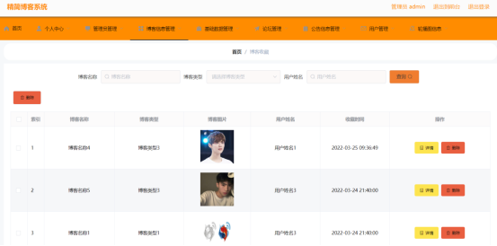 通过设计的博客收藏管理功能模块,管理用户可以对相关的博客收藏信息进行管理,比如管理用户可以查看博客收藏时间信息,删除已经失效的博客收藏信息记录等操作,博客收藏管理界面设计如图5-10所示。