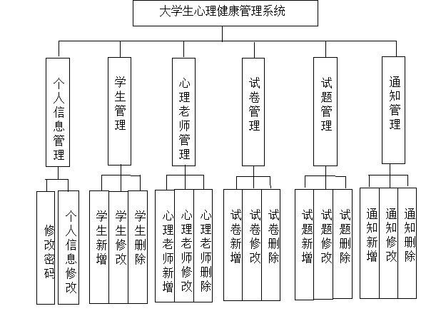大学生心理健康管理系统系统在进行系统中功能模块的划分时,采用层次图来进行表示。层次图具有树形结构,它能使用矩形框来描绘数据信息。顶层代表的数据结构很完整,顶层下面的矩形框表示的数据就是子集数据,当然处于最下面的矩形框就是不能再进行细分的数据元素了,使用层次方框图描述系统功能能让用户一目了然,能够明白系统的功能,以及对应功能板块下面的子功能都可以清楚领会。大学生心理健康管理系统分为管理员和用户两部分操作角色,下面将对他们的功能进行阐述。