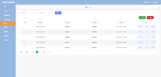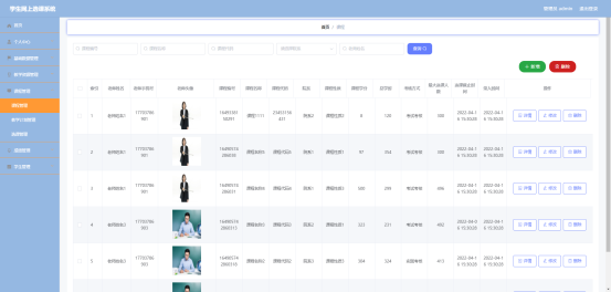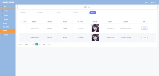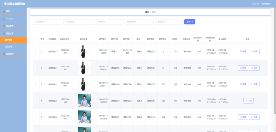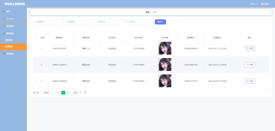 图5.5 即为编码实现的选课管理界面,选课信息包括学生手机号,学生头像,学生姓名,课程名称,课程编号等信息,老师通过课程名称,学生姓名或选课编号都能查询学生选课信息,也能对学生选课详情进行查看。