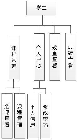 图4.3即为设计的学生功能结构,学生权限操作的功能包括查看教室,查看课程并选择需要学习的课程,查看成绩等。