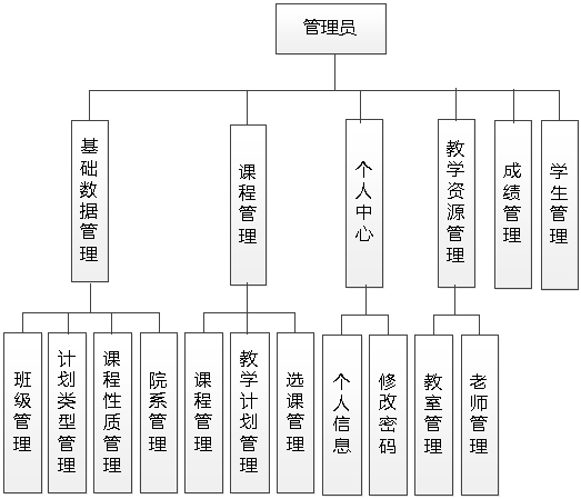 图4.1即为设计的管理员功能结构,管理员权限操作的功能包括管理教学资源,管理课程,管理教学计划,管理选课,管理成绩,管理基础数据,其中基础数据管理包括班级管理,计划类型管理,课程性质管理,院系管理等子功能模块。