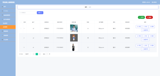 图5.3 即为编码实现的老师管理界面,老师信息包括擅长,性别,姓名,老师头像等信息,管理员可以删除需要删除的老师信息,可以查询老师,重置老师账号的密码等。