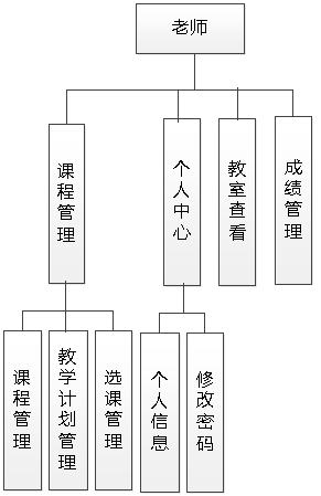 图4.2即为设计的老师功能结构,老师权限操作的功能包括查看教室,管理课程,管理选课,管理成绩等。