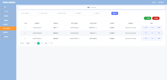图5.4 即为编码实现的教学计划管理界面,教学计划信息包括教学计划名称,教学计划类型,教学计划编号,课程名称等信息,老师可以查询教学计划信息,可以新增教学计划信息,可以删除需要删除的教学计划信息等。
