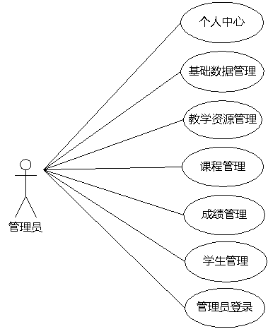 图3.5即为管理员用例图,管理员权限操作的功能包括管理教学资源,管理课程,管理教学计划,管理选课,管理成绩,管理基础数据,其中基础数据管理包括班级管理,计划类型管理,课程性质管理,院系管理等子功能模块。