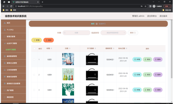如图5.2显示的就是学习视频管理页面,此页面提供给管理员的功能有:查看已发布的学习视频数据,修改学习视频,学习视频作废,即可删除,还进行了对学习视频名称的模糊查询 学习视频信息的类型查询等等一些条件。
