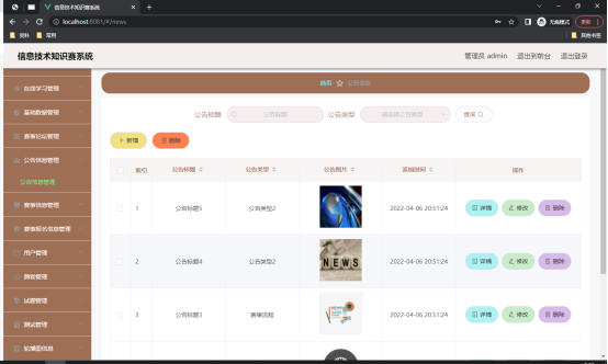 如图5.4显示的就是公告信息管理页面,此页面提供给管理员的功能有:根据公告信息进行新增、修改、查询操作等等。
