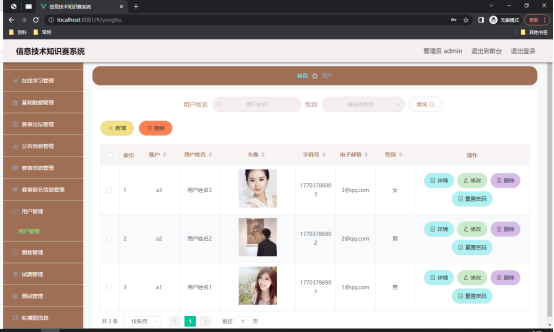如图5.1显示的就是用户信息管理页面,此页面提供给管理员的功能有:用户信息的查询管理,可以删除用户信息、修改用户信息、新增用户信息,