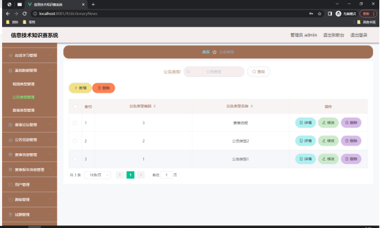 如图5.3显示的就是公告类型管理页面,此页面提供给管理员的功能有:根据公告类型进行条件查询,还可以对公告类型进行新增、修改、查询操作等等。