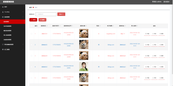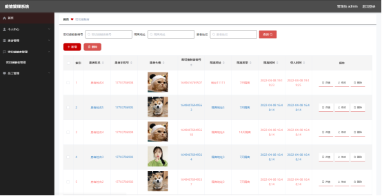 如图5.2显示的就是密切接触者管理页面,此页面提供给管理员的功能有:新增密切接触者,修改密切接触者,删除密切接触者。