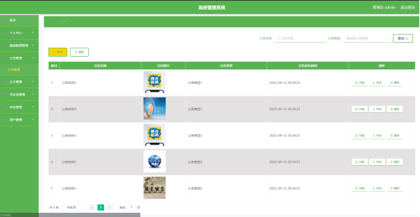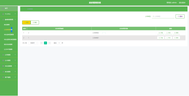 公告类型管理页面显示所有公告类型,在此页面既可以让管理员添加新的公告信息类型,也能对已有的公告类型信息执行编辑更新,失效的公告类型信息也能让管理员快速删除。下图就是公告类型管理页面。