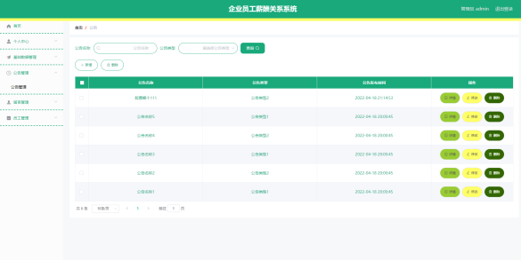 如图5.1显示的就是薪资列表页面,此页面提供给管理员的功能有:查看薪资、新增薪资、修改薪资、删除薪资等。