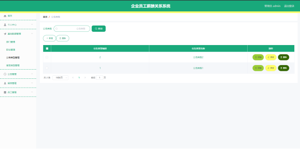 公告类型管理页面显示所有公告类型,在此页面既可以让管理员添加新的公告信息类型,也能对已有的公告类型信息执行编辑更新,失效的公告类型信息也能让管理员快速删除。下图就是公告类型管理页面。公告类型管理界面如图5.3所示。