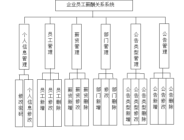 企业员工薪酬关系系统系统在进行系统中功能模块的划分时,采用层次图来进行表示。层次图具有树形结构,它能使用矩形框来描绘数据信息。顶层代表的数据结构很完整,顶层下面的矩形框表示的数据就是子集数据,当然处于最下面的矩形框就是不能再进行细分的数据元素了,使用层次方框图描述系统功能能让用户一目了然,能够明白系统的功能,以及对应功能板块下面的子功能都可以清楚领会。企业员工薪酬关系系统分为管理员和用户两部分操作角色,下面将对他们的功能进行阐述。