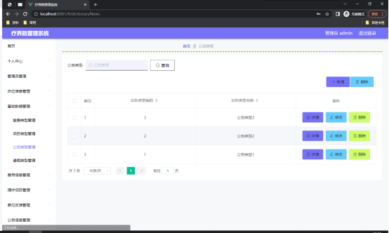 如图5.3显示的就是公告类型管理页面,此页面提供给管理员的功能有:根据公告类型进行条件查询,还可以对公告类型进行新增、修改、查询操作等等。