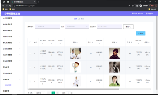 如图5.1显示的就是患者信息管理页面,此页面提供给管理员的功能有:患者信息的查询管理,可以删除患者信息、修改患者信息、新增患者信息,