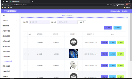 如图5.4显示的就是公告信息管理页面,此页面提供给管理员的功能有:根据公告信息进行新增、修改、查询操作等等。