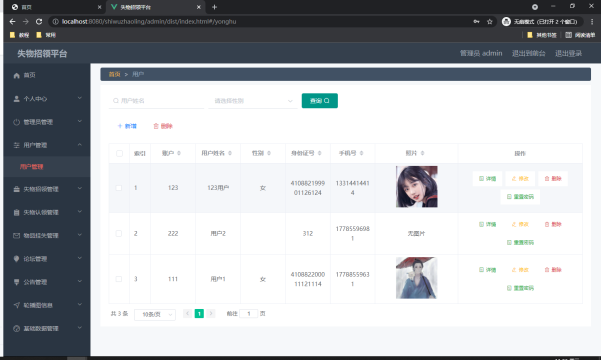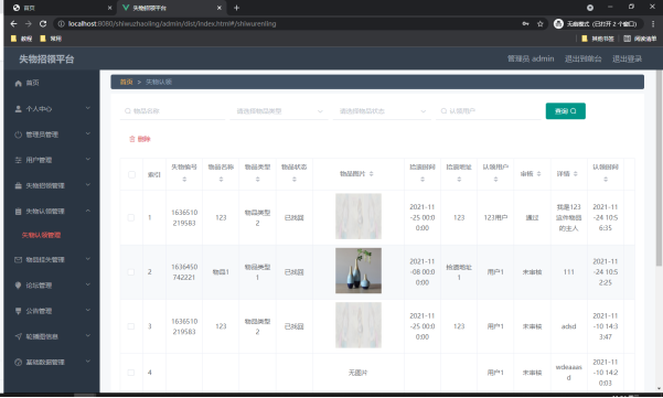 如图5.3显示的就是失物认领管理页面,此页面提供给管理员的功能有:根据失物认领进行条件查询,还可以对失物认领进行新增、修改、查询操作等等。