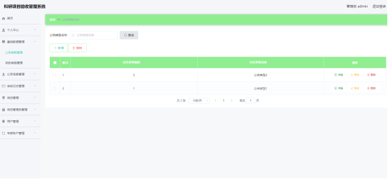 公告类型管理页面显示所有公告类型,在此页面既可以让管理员添加新的公告信息类型,也能对已有的公告类型信息执行编辑更新,失效的公告类型信息也能让管理员快速删除。下图就是公告类型管理页面。
