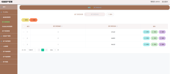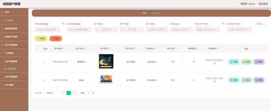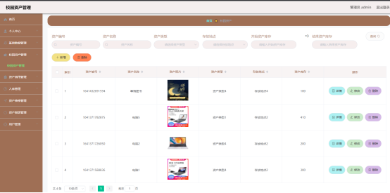 如图5.1显示的就是校园资产列表页面,此页面提供给管理员的功能有:查看校园资产、新增校园资产、修改校园资产、删除校园资产等。