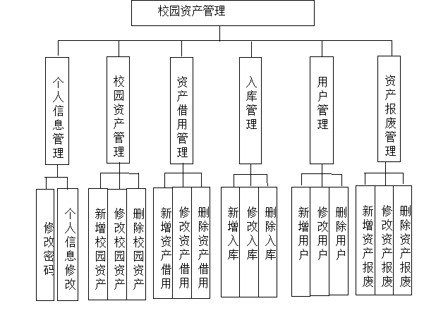在分析并得出使用者对程序的功能要求时,就可以进行程序设计了。如图4.2展示的就是管理员功能结构图,管理员在后台主要管理资产等。