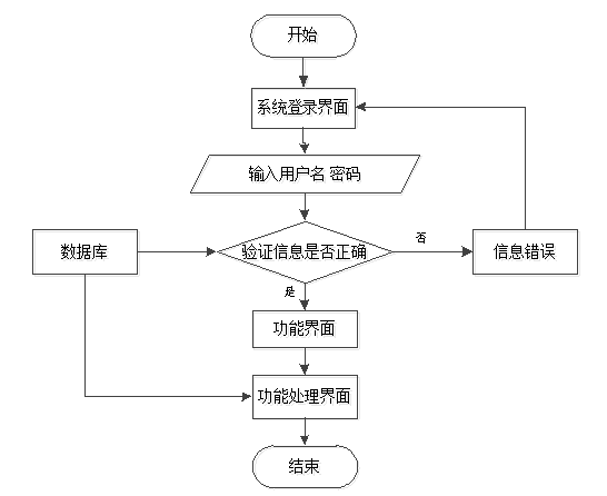 程序上交给用户进行使用时,需要提供程序的操作流程图(如图3.1所示),这样便于用户容易理解程序的具体工作步骤,现如今程序的操作流程都有一个大致的标准,即先通过登录页面提交登录数据,通过程序验证正确之后,用户才能在程序功能操作区页面操作对应的功能。