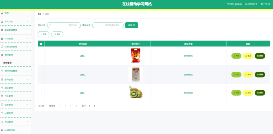 如图5.1显示的就是课程列表页面,此页面提供给管理员的功能有:查看课程、新增课程、修改课程、删除课程等。