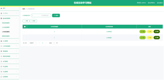 公告类型管理页面显示所有公告类型,在此页面既可以让管理员添加新的公告信息类型,也能对已有的公告类型信息执行编辑更新,失效的公告类型信息也能让管理员快速删除。下图就是公告类型管理页面。