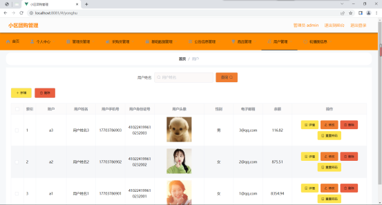 如图5.1显示的就是用户信息管理页面,此页面提供给管理员的功能有:用户信息的查询管理,可以删除用户信息、修改用户信息、新增用户信息,