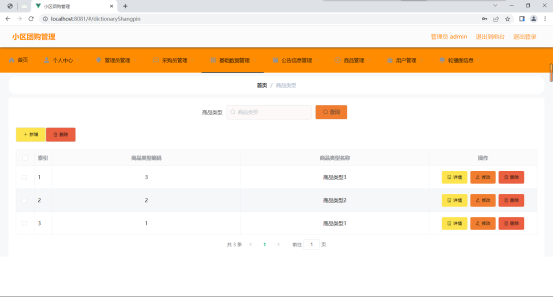 如图5.3显示的就是商品类型管理页面,此页面提供给管理员的功能有:根据商品类型进行条件查询,还可以对商品类型进行新增、修改、查询操作等等。