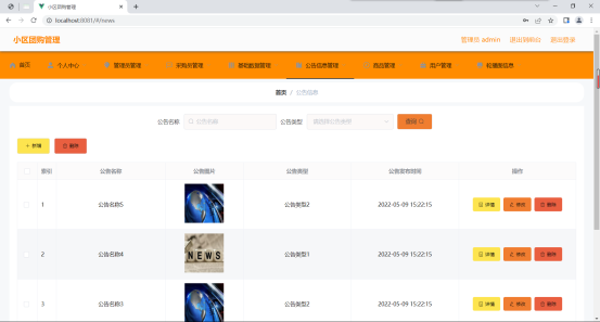 如图5.4显示的就是公告信息管理页面,此页面提供给管理员的功能有:根据公告信息进行新增、修改、查询操作等等。