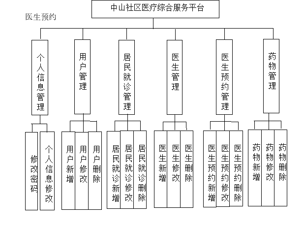 中山社区医疗综合服务平台系统在进行系统中功能模块的划分时,采用层次图来进行表示。层次图具有树形结构,它能使用矩形框来描绘数据信息。顶层代表的数据结构很完整,顶层下面的矩形框表示的数据就是子集数据,当然处于最下面的矩形框就是不能再进行细分的数据元素了,使用层次方框图描述系统功能能让用户一目了然,能够明白系统的功能,以及对应功能板块下面的子功能都可以清楚领会。中山社区医疗综合服务平台分为管理员和用户两部分操作角色,下面将对他们的功能进行阐述。