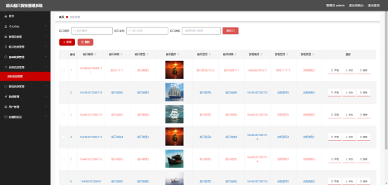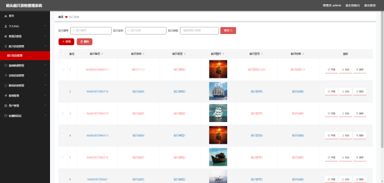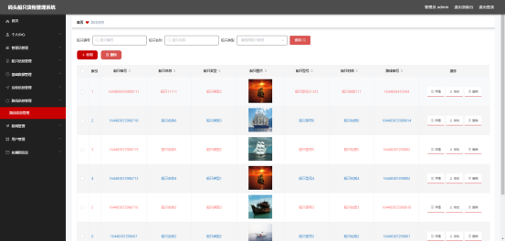 图5.1 即为编码实现的船只信息管理界面,管理员在该界面中新增船只信息,船只信息包括船只材质,船只型号等信息,管理员可以对船只信息进行查询,更改等操作。