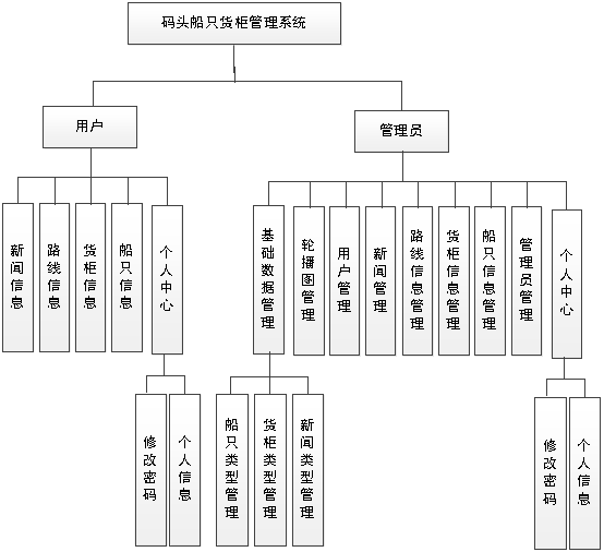 图4.1即为设计的系统功能结构,系统分为管理员和用户两个操作权限,管理员权限操作的功能包括管理用户,管理船只,管理路线,管理货柜,管理新闻等。用户权限操作的功能包括查看船只,查看新闻,查看路线以及货柜信息等。